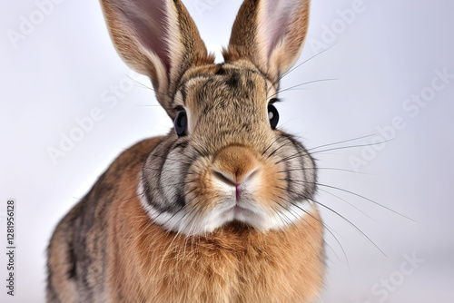 Close-Up Portrait of a Brown Rabbit with Fluffy Fur, Long Whiskers, and Large Ears on a White Background