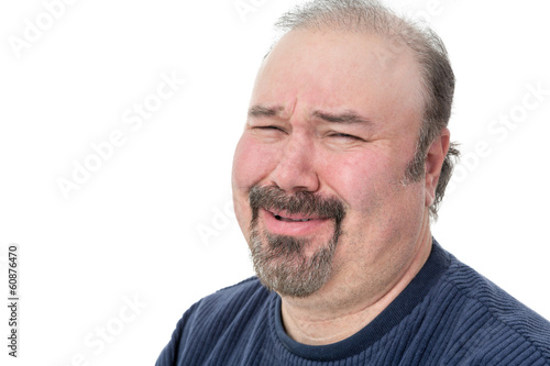 balding, goatee, isolated, male, man, on white, expression, closeup, face, person, middle-aged, sweater, copy space, portrait, disbelief, laughing, ridicule, dubious, sceptical, scepticism, emotion, expressive, grimace, reaction, comical, distrust, mental, amusement, beard, mistrust, smirk, smile, smiling, ridiculous, unbelievable, overweight, derision, droll, ludicrous, funny