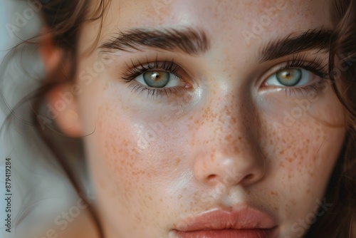 portrait, closeup, woman, freckle, green eye, natural beauty, face, skin, eyebrow, eyelash, lip, youthful, fresh, serene, detailed, expression, beauty, feminine, soft light, texture, complexion, feature, gaze, intimate, personal, close, natural, authentic, real, human, person, individual, unique, striking, captivating, delicate, calm, peaceful, relaxed, gentle, smooth, flawless, pure, minimalistic