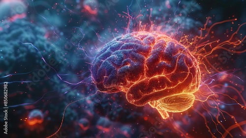 Closeup view of the human brain with visible neural pathways and electrical activity