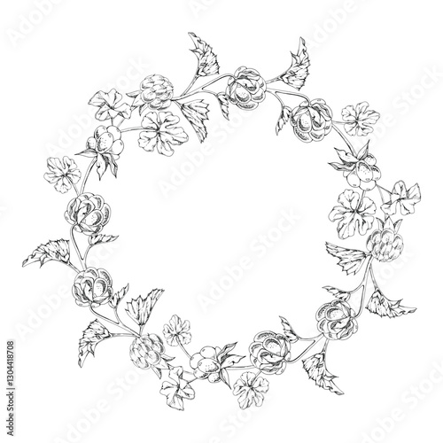 Cloudberry raspberry on stems with plant leaves hand drawn vector ink, line ripe forest berry. Isolated botanical illustration wreath round frame. Restaurant, cafe menu, farmers market, recipe book