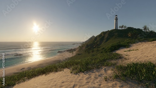 ocean, sea, coast, coastal, beach, sand, sandy, dune, grass, grassy, hill, elevated, island, tropical, palm, tree, lighthouse, beacon, tower, structure, navigation, guidance, warning, safety, marin, nautical, maritime, voyage, journey, exploration, nature, natural, landscape, seascape, scenic, view, horizon, sunrise, dawn, morning, light, sunlight, bright, clear, sky, blue, serene, peaceful, remote