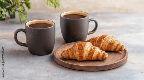 coffee and bakery concept. A cozy setting featuring two cups of coffee and freshly baked croissants on a wooden plate, perfect for breakfast or brunch.