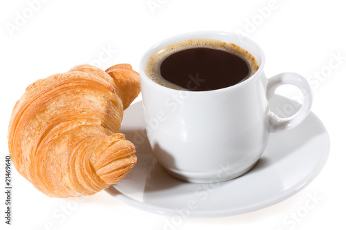 hot drink, croissant, breakfast, beverage, bread, morning, cup, drink, espresso, black, mug, sweet, white, liquid