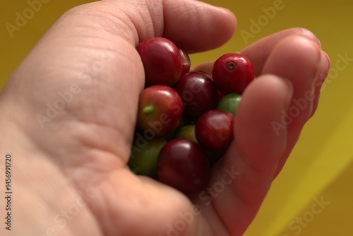 "Coffee beans and coffee cherries with instant coffee granules on yellow background – caffeine and natural energy concept"