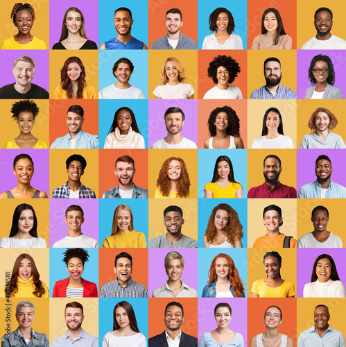 Collage of multiracial people portraits with faces over colorful backgrounds