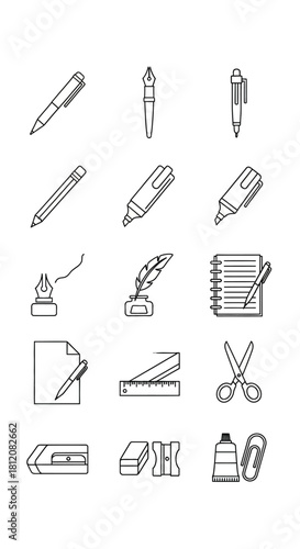 Collection of Black and White Line Art Icons of Writing and Office Supplies.