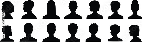 illustration, background, collection, group, graphic, black, curly, side, art, hair, ponytail, front, feature, silhouette, head, elegant, modern, long, updo, profile, abstract, short, female, design, icon, vector, style, profile, silhouette, symbol, avatar, people, set, user, person, business, woman, face, man, icon, signs, web, social, cyberspace