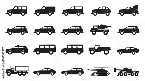 car, truck, bus, helicopter, suv, van, coupe, ambulance, cement mixer, transport, vehicle, silhouette, black, white, icon, graphic, collection, set, transportation, automotive, travel