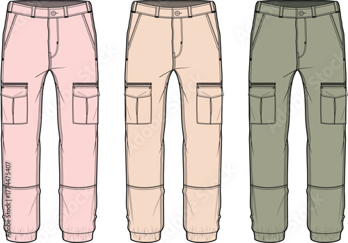 Collection of cargo pants fashion flat sketches in multiple colors. Vector apparel design template for clothing manufacturing and tech packs