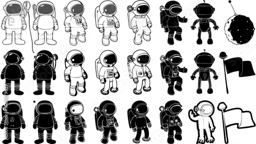 silhouette, astronaut, cartoon, space, moon, flag, helmet, rocket, exploration, outer space, character, drawing, illustration, vector, graphic, design, icon, symbol, clip art, isolated, white background, black-and-white, space-travel, science, technology, adventure, mission, universe, galaxy, star, planet, suit, equipment, astronaut, spacecraft, future, journey, fantasy, collection