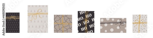 Collection of Christmas gifts for decorations, holiday gifts, winter knitted woolen clothes, pattern. Christmas gifts icon set isolated on white background. Vector illustration.
