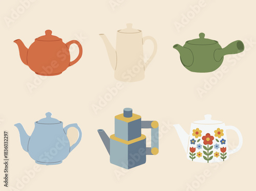 teapot, tea, collection, ceramic, vintage, retro, design, kitchen, drink, porcelain, tableware, colourful, unique, illustration, art, decorative, orange, white, green, blue, geometric, floral, pattern, style, antique, domestic, household, object, still, life, graphic, shape, vessel, container, handle, spout, lid, set, variety, assortment, display, arrangement, drawing, clip art, icon, symbol, element, isolated, background