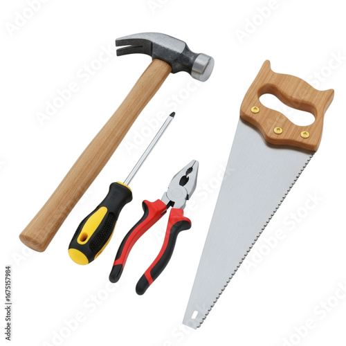 tool, hand tool, hammer, screwdriver, plier, saw, handsaw, carpenter's shop, construction, bricolage, repair, building, craft, workshop, hardware, equipment, instrument, metal, wood, handle, steel, tool kit, set, collection, isolated, object, overhead, group, work, project, labor, utility, instrumentation, machinery