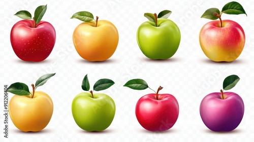 apple, fruit, red, green, yellow, purple, illustration, digital, realistic, stem, leaf, leaf, collection, set, graphic, design, nature, food, healthy, fresh, crisp, sweet, tart, juicy, delicious, organic, vegan, vegetarian, vitamin, alimentary, colourful, bright, shiny, glossy, smooth, round, shape, background, white, transparent
