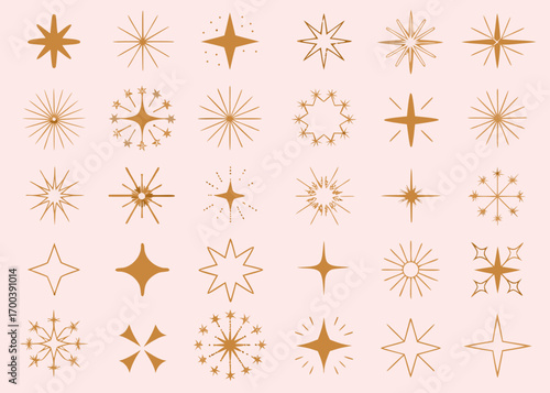 starburst, sparkle, star, icon, set, collection, design, element, graphic, illustration, gold, gold, bronze, copper, abstract, geometric, shine, light, bright, celebration, festive, holiday, new, year, christmas, party, background, pink, pattern, vector