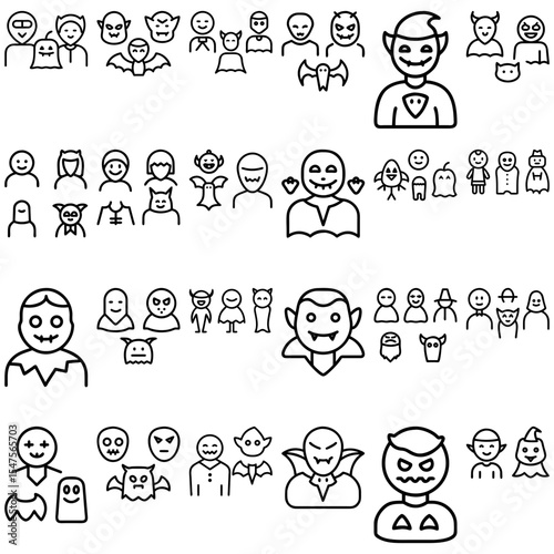 halloween, icon, vampire, ghost, skittish, character, black, white, collection, monster, devil, bat, pumpkin, cat, daemon, creature, outline, drawing, clip art, symbol, signs, graphic, design, art, illustration, iconography, silhouette, cartoon, cute, scarey, party, holiday, celebration, trick, treat, costume, mask, face, head, body, person, figure, shape, element, image, vector, line, artwork, simple