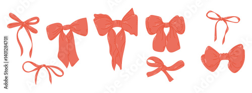 Collection of hand drawn red bows in various elegant shapes and knot styles. Concept of celebration, decoration and feminine charm in a ribbon illustration set