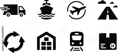 logistic, transportation, icon, delivery, shipping, truck, ship, aeroplane, train, warehouse, package, road, recycling, movement, global, industry, business, vector, graphic, symbol, illustration, service, commerce, freight, cargo, network, collection, set, minimalist