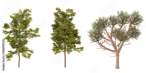 collection of three trees with unique shapes and characteristics. Here is a description for each tree, The leaves are dense green, ideal for depicting typical savanna or tropical trees, Gives a shady