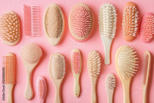 Collection of various hairbrushes and combs arranged on a pink surface showcasing diverse styles and textures