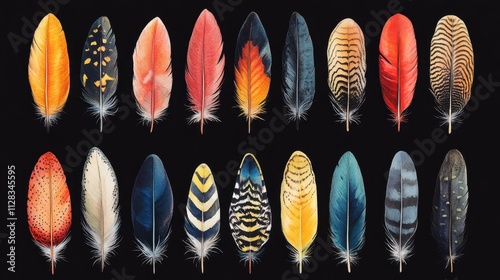 feather, plumage, bird, wing, quill, pattern, texture, colourful, vibrant, exotic, tropical, nature, wildlife, animal, art, illustration, watercolor, painting, background, wallpaper, graphic, element, decoration, detail, aesthetic, beauty, elegance, style, fashion, trend, collection, set, variety, diversity, bright, dark, contrast, black, white, red, orange, yellow, green, blue, purple, brown