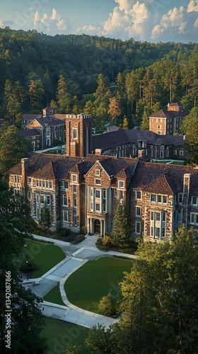 campus, aerial, architecture, college, building, tree, hill, sunlit, landscape, education, university, scenic, view, student, forest, exterior, ivy, gated, park, garden, brick, stone, tower, green, school, historic, dorm, tranquil, nature, calm, perspective, photographic, impressive, beautiful, stunning, excellent, high, image, elegant, grand, quality, architectural