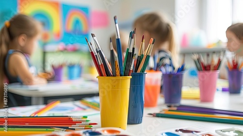 Colorful art supplies and children painting in a classroom setting, fostering creativity and learning through artistic expression.