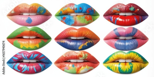 Colorful artistic collage of vibrant lips with creative designs on white background