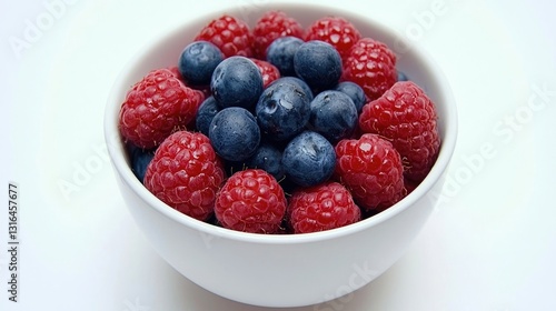 Colorful Bowl of Fresh Raspberries and Blueberries on a White Background for a Healthy Snack or Dessert