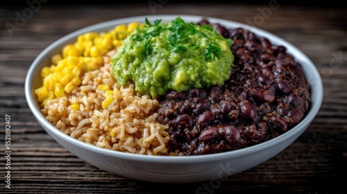 Colorful bowl of rice beans and guacamole topped with fresh cilantro and corn showcasing a vibrant Mexican culinary experience on a rustic wooden backdrop representing authentic flavors