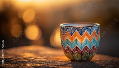 mug, cup, ceramic, sunset, sunrise, chevron, pattern, colourful, many-coloured, orange, blue, green, red, yellow, teal, turquoise, brown, pink, design, beverage, tea, hot drink, hot, warm, drink, stone, rock, nature, background, bokeh, light, gold, warmth, cosy, relaxing, peaceful, morning, evening, vibrant, home, decor, table, surface, image, photo, art, aesthetic
