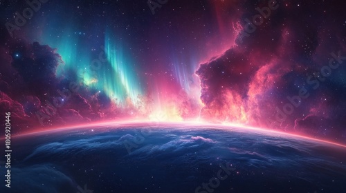 Colorful cosmic horizon over a planet with glowing atmosphere, teal aurora and pink nebula clouds under a starlit sky evoking awe and serene wonder