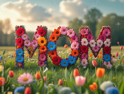 Colorful field of tulips and wildflowers with flower letters forming the word "MOM", capturing the beauty of nature, springtime, and heartfelt Mother’s Day celebration