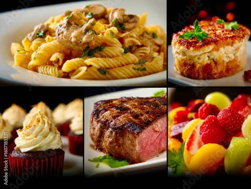 Colorful Food Collage Featuring Pasta, Steak, Muffins and Coffee