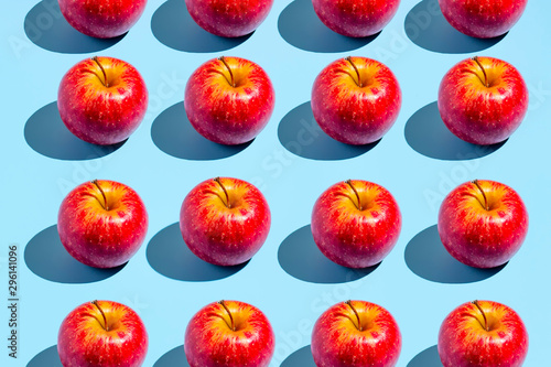Colorful fruit pattern of fresh red apples on blue background. From top view. Creative concept.