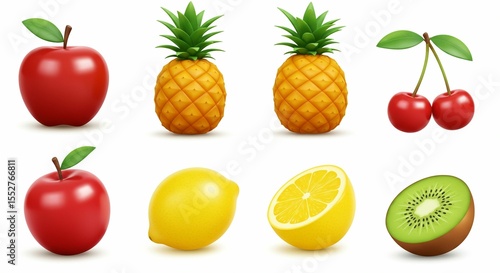 fruit, apple, pineapple, cherry, lemon, kiwi, red, yellow, green, digital illustration, realistic, three-dimensional, illustration, food, healthy, vitamin, nourishment, vector, isolated, design, poster, cardboard box, healthy eating, background, graphic design, fresh fruit, vitamin c, healthy lifestyle, diet, food photography, fruit market