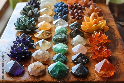 Colorful healing crystals and succulent-shaped stones arranged on wooden surface, featuring amethyst, quartz, jade and citrine minerals in natural light.