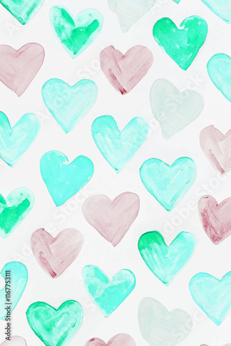 Colorful heart patterns, watercolor style, soft pastel colors, romantic design, playful background, perfect for Valentine's Day.