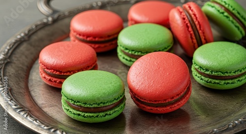 Colorful Holiday Macarons on Silver Tray in Festive Red and Green Palette