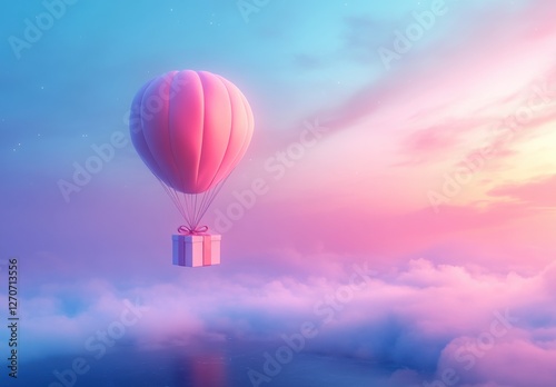 Colorful Hot Air Balloon with Gift Box Ascending Above Dreamy Clouds at Sunrise in a Soft Pastel Sky