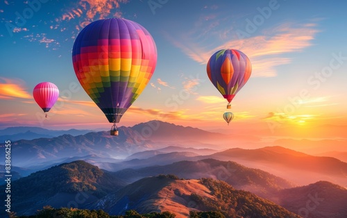 Colorful hot air balloons floating over mountains at sunrise. A wide view of the beautiful landscape with flying balloons, colorful rocks and misty valley