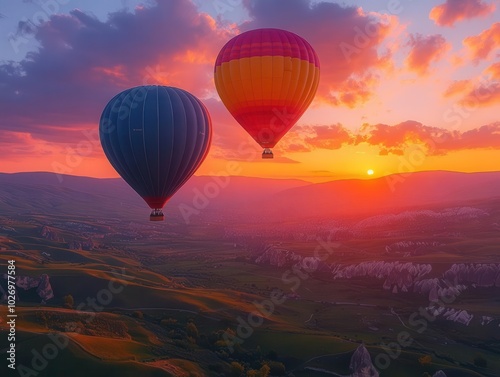 colorful hot air balloons soaring high over the enchanting landscapes of turkey at sunrise, casting vibrant reflections on the serene valleys below, creating a magical atmosphere of adventure