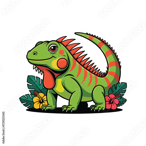 Colorful Iguana Cartoon Vector – Green Lizard with Tropical Flowers and Leaves Illustration