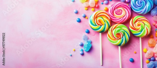 Colorful Lollipops and Candy on Pink Background with Joyful Little Girl Smiling in Candy Shop Surrounded by Sweets and Copyspace for Text
