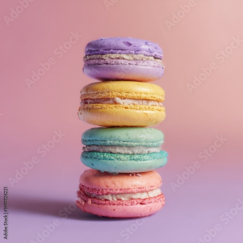 Colorful macarons stacked on pastel background, food photography, for website or recipe blog