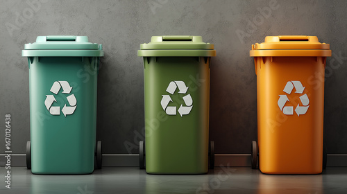 Colorful Recycling Bins For Waste Separation: Blue, Yellow, And Red Containers Against Vibrant Urban Wall