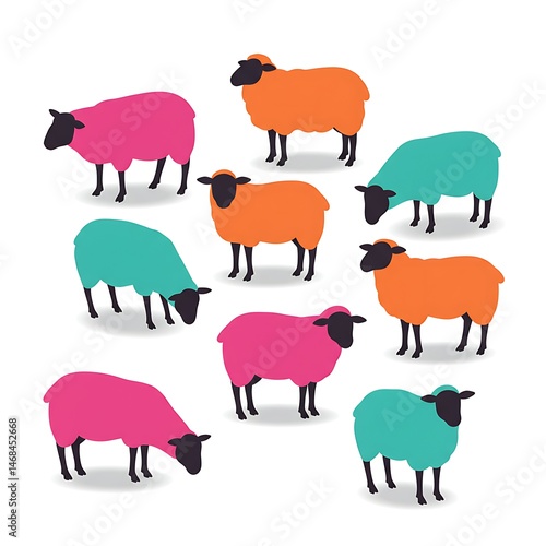 sheep, animal, pattern, farm, wool, cute, fluffy, colourful, pink, teal, orange, black, white, background, lamb, farm animal, standing, isolated, illustration, domestic, mammal, pasture, spring, summer, countryside, agriculture, symbol, graphic, cartoon, design, element, drawing, decorative, herd, farm animal, silhouette, shape, creative