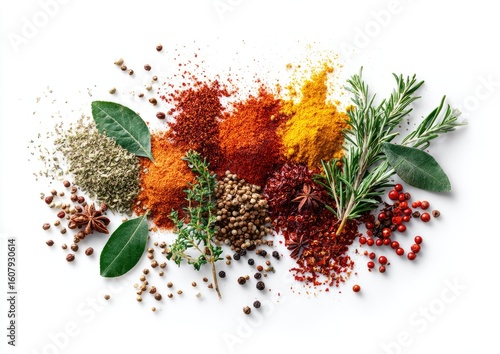 spice, blend, colourful, powder, herb, rosemary, thyme, bay leaf, pepper, cumin, turmeric, cinnamon, paprika, chili, star anise, alimentary, favor, aroma, cookery, cooking, food, ingredient, diverse, natural, organic, healthy, delicious, oriental, indian, italian, eastern, western, savoury, hot, warm, bright, texture, heap, top, view, isolated, white, background, arrangement, composition, spice, epicure, exotic