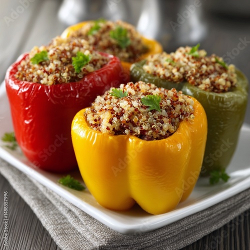 Colorful stuffed bell peppers with quinoa and herbs served on a white platter for healthy meals and vibrant dinner presentation